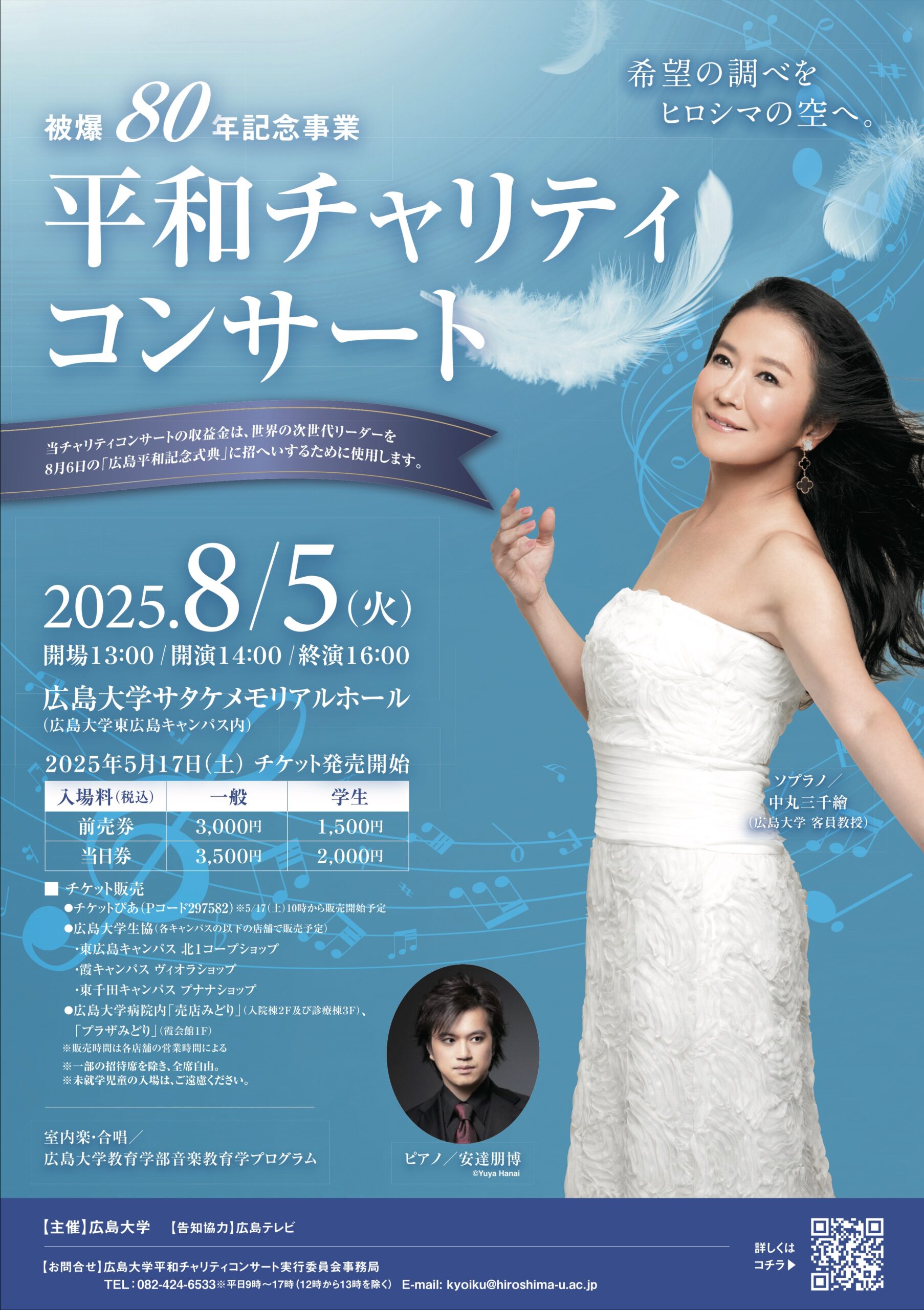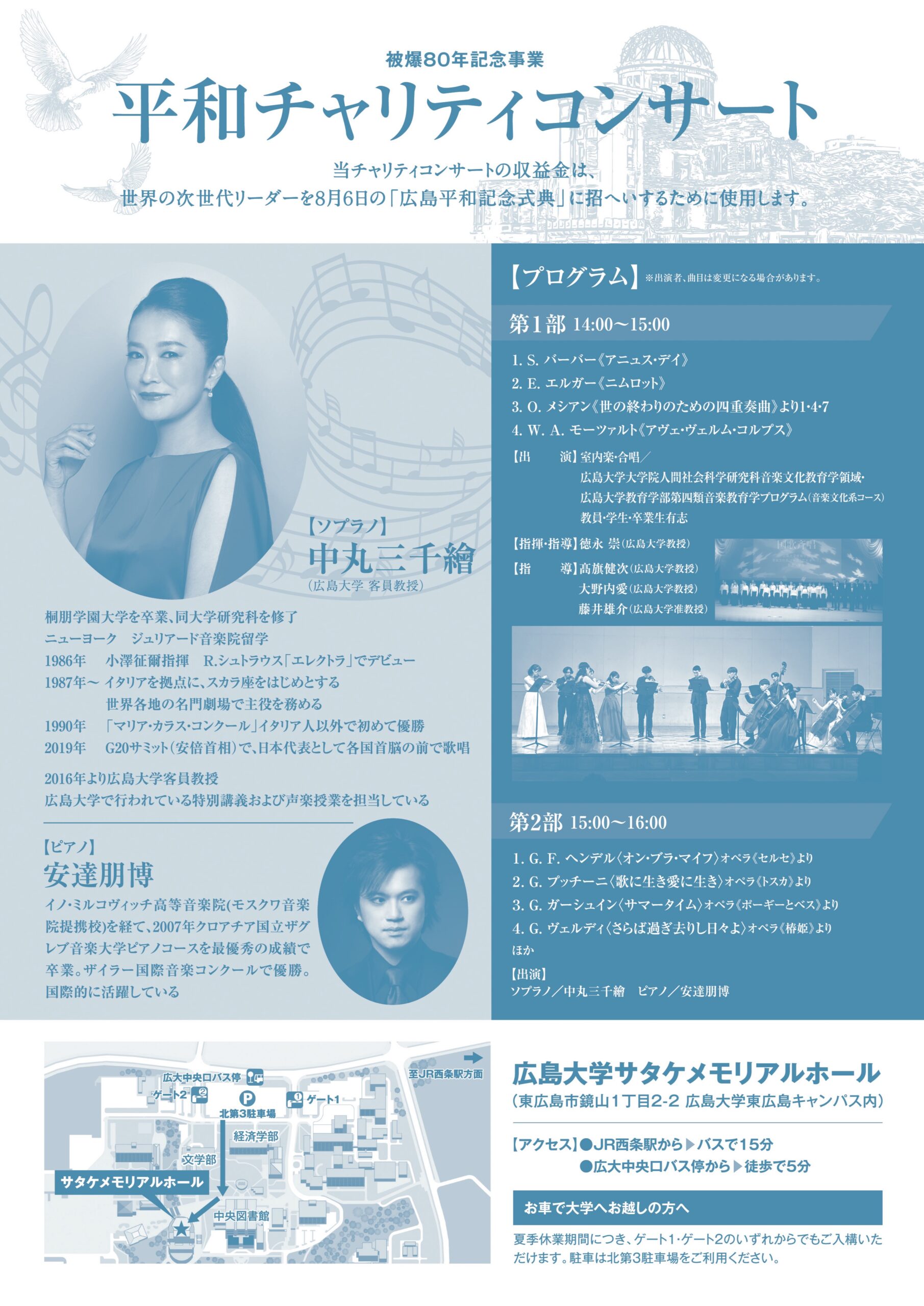 本年、広島は被爆80年と言う節目の年を迎えます。そこで広島大学では、8月5日(火)に東広島キャンパスのサタケメモリアルホールにて、世界的オペラ歌手 中丸三千繪さんをお迎えし、別紙のとおり平和チャリティコンサートを開催することとしました。平和の祈りを胸に、音楽を通じて過去を振り返り、未来に希望をつなぐ事業となれば幸いです。コンサートの収益金は、世界の次世代リーダーを8月6日の「広島平和記念式典」に招へいするために活用する予定です。つきましては、同窓会会員の皆様にも多数ご参加いただきたく、添付のとおりご案内申し上げます。